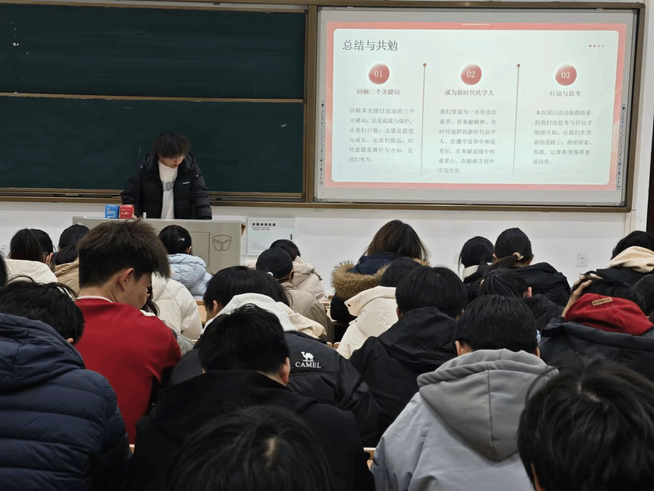 结合国际志愿者日,团支书首先播放国际志愿者日宣传视频,带领同学们深入学习领会习近平总书记关于志愿服务的重要论述。随后,他巧妙地将志愿服务与化学专业相连接,为同学们打开化学人“志愿+”的全新视野,介绍化学人在志愿服务领域的多种可能。