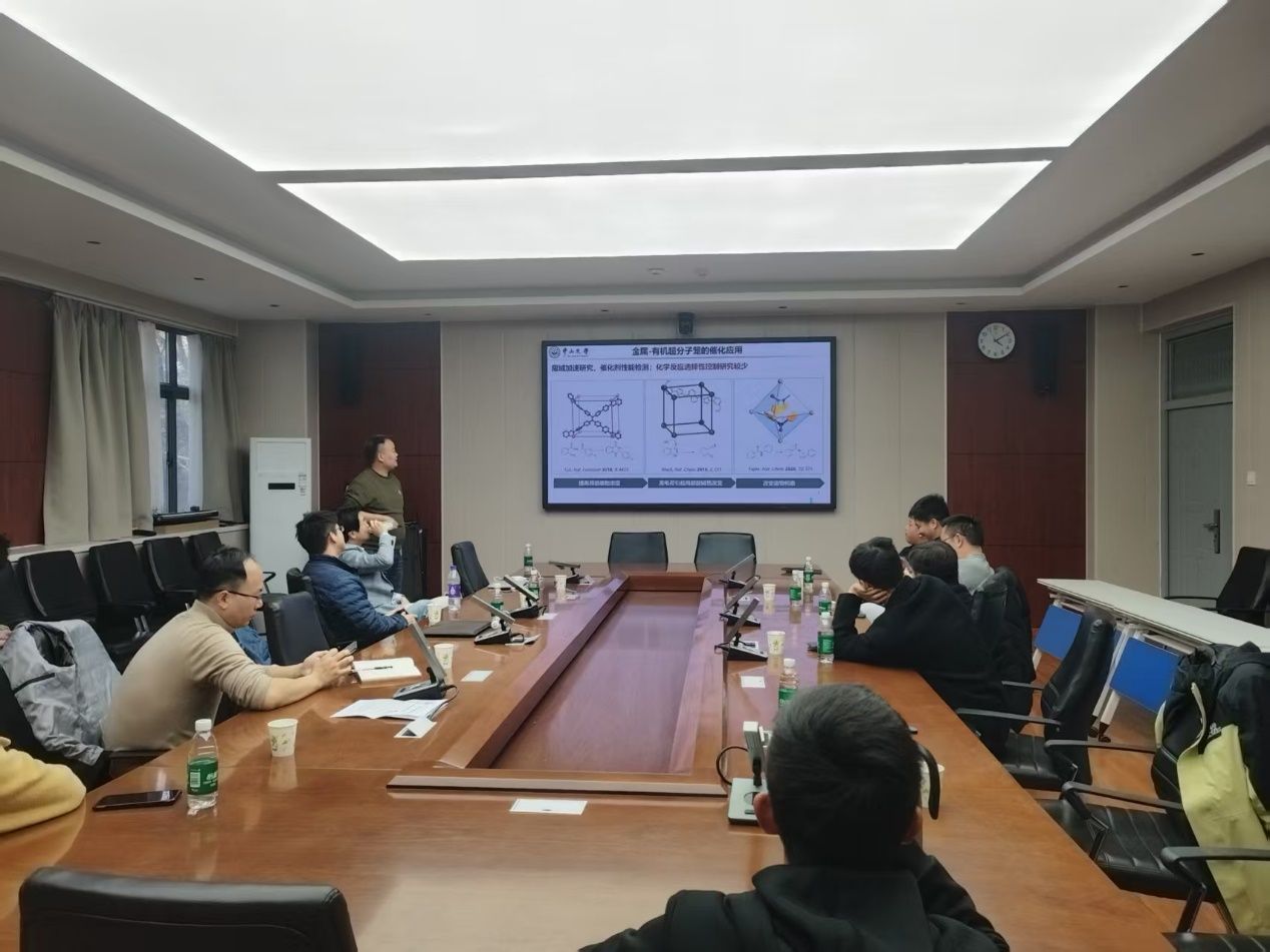 在报告中,焦志威介绍了团队近年来在利用金属-有机配位分子笼作为类酶催化剂,通过调控超分子限域空腔和催化位点,发展基于主客体作用的超分子催化体系,用于可见光促进的多烯化合物的立体选择性多样性转化,实现了超分子限域空间群手性向碳中心的多层次手性精准传递。焦志威团队基于发展的合成策略,实现了Pancratistatin类天然产物分子发散式合成及类天然产物分子库的快速构建。报告结束后,焦志威与在场师生进行了热烈讨论,就该领域的未来发展及存在的问题进行了深入交流。