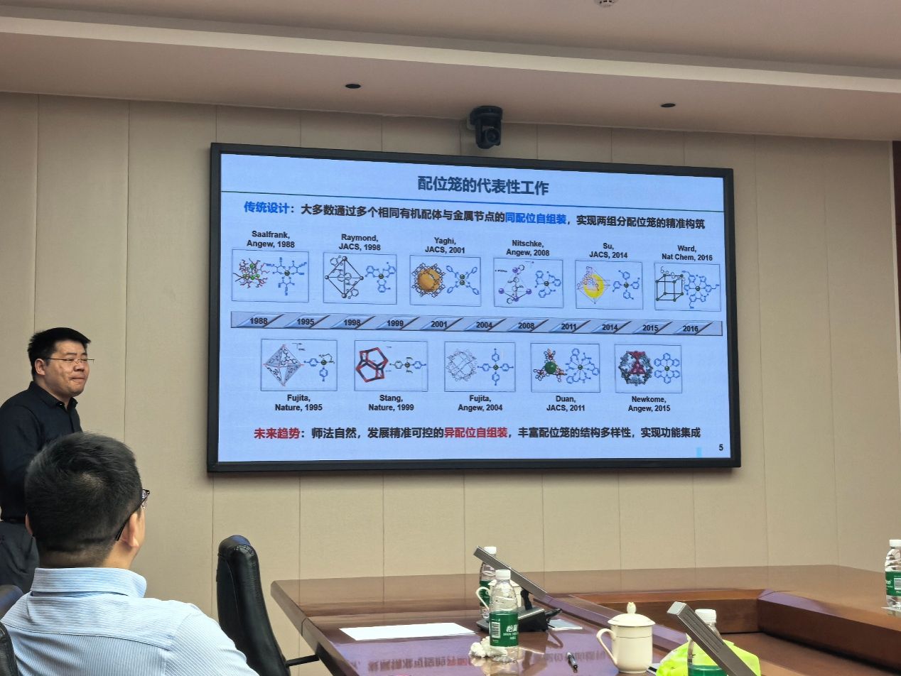 在报告中,张明明围绕配位自组装研究从结构构筑向功能导向设计转变这一学科发展趋势,系统介绍了其课题组近年来在异配位超分子体系精准构筑及功能化方面取得的系列研究进展。张明明指出,异配位自组装由于能够通过异质组分间的协同作用实现功能“涌现”,在功能材料领域展现出巨大潜力,但其发展长期受制于组装可控性不足和方法普适性有限等关键挑战。针对上述问题,张明明重点介绍了课题组提出的 “多齿配体协同组装”与“多金属中心正交自组装”等新策略,实现了多种高阶、大尺寸配位拓扑结构的精准可控构筑。在此基础上,通过对功能单元的精准集成,团队成功构筑了一系列兼具高活性与优异稳定性的配位笼基功能材料,并在光催化产氢、选择性氧化及污染物降解等方面表现出突出的应用性能。报告结束后,张明明与在场师生就配位自组装策略设计、功能协同机制以及材料应用前景等问题进行了深入交流,并耐心解答了大家提出的问题。